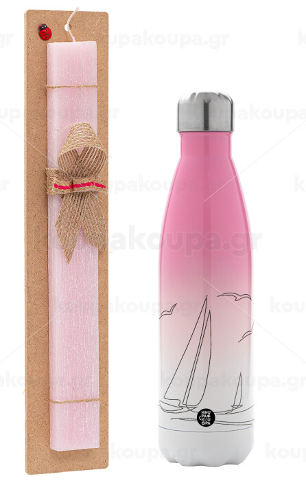 Ιστιοπλοΐα Sailing, Πασχαλινή Λαμπάδα με Μεταλλικό παγούρι θερμός Ροζ/Λευκό (Stainless steel), διπλού τοιχώματος, 500ml & κερί αρωματικό πλακέ (30cm) (ΡΟΖ)