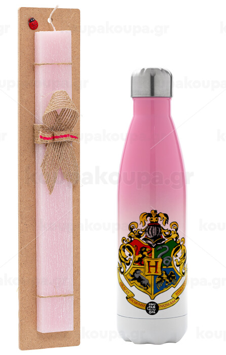 Hogwart's, Πασχαλινή Λαμπάδα με Μεταλλικό παγούρι θερμός Ροζ/Λευκό (Stainless steel), διπλού τοιχώματος, 500ml & κερί αρωματικό πλακέ (30cm) (ΡΟΖ)