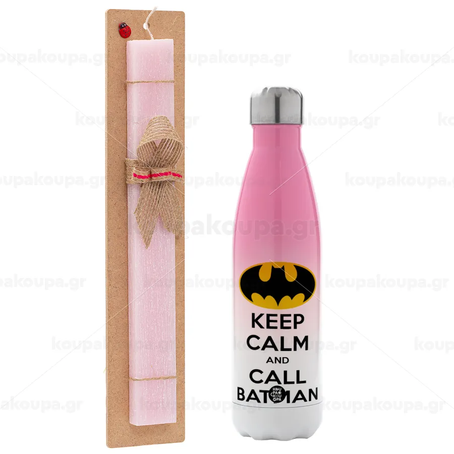 KEEP CALM & Call BATMAN, Πασχαλινή Λαμπάδα με Μεταλλικό παγούρι θερμός Ροζ/Λευκό (Stainless steel), διπλού τοιχώματος, 500ml & κερί αρωματικό πλακέ (30cm) (ΡΟΖ)
