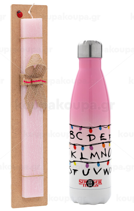 Stranger Things ABC, Πασχαλινή Λαμπάδα με Μεταλλικό παγούρι θερμός Ροζ/Λευκό (Stainless steel), διπλού τοιχώματος, 500ml & κερί αρωματικό πλακέ (30cm) (ΡΟΖ)