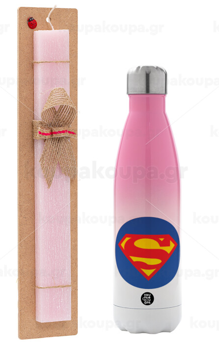 Superman, Πασχαλινή Λαμπάδα με Μεταλλικό παγούρι θερμός Ροζ/Λευκό (Stainless steel), διπλού τοιχώματος, 500ml & κερί αρωματικό πλακέ (30cm) (ΡΟΖ)