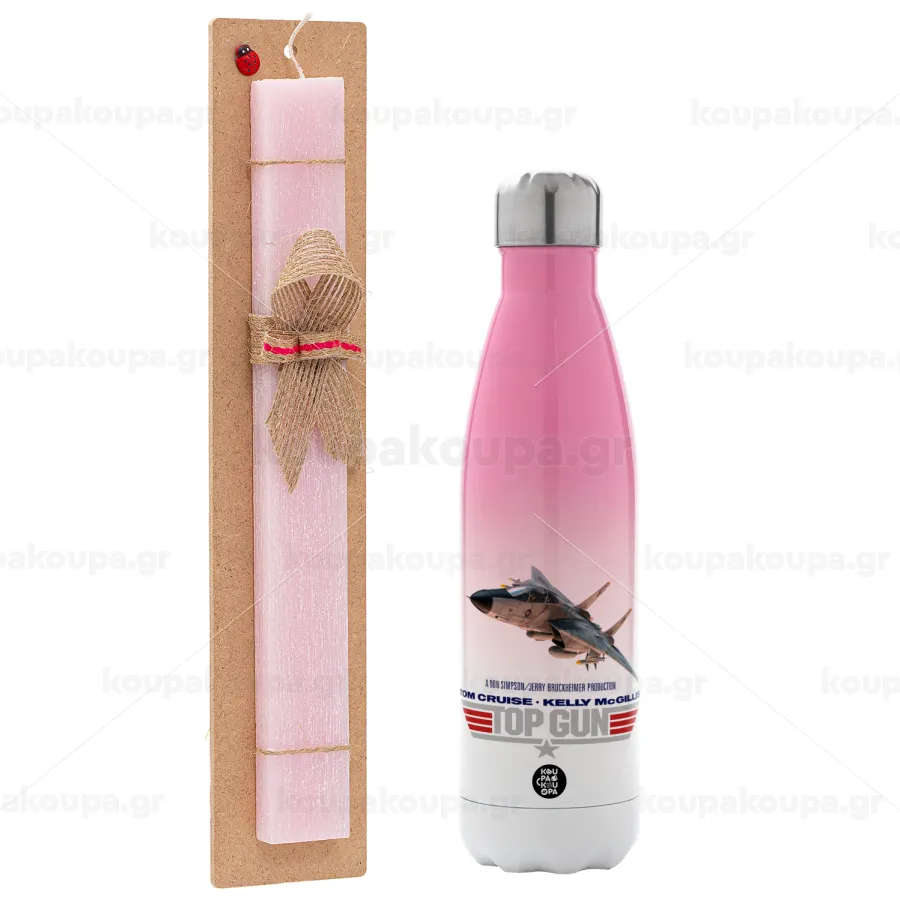 Top Gun, Πασχαλινή Λαμπάδα με Μεταλλικό παγούρι θερμός Ροζ/Λευκό (Stainless steel), διπλού τοιχώματος, 500ml & κερί αρωματικό πλακέ (30cm) (ΡΟΖ)