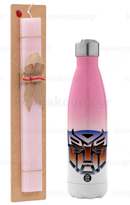 Transformers, Πασχαλινή Λαμπάδα με Μεταλλικό παγούρι θερμός Ροζ/Λευκό (Stainless steel), διπλού τοιχώματος, 500ml & κερί αρωματικό πλακέ (30cm) (ΡΟΖ)
