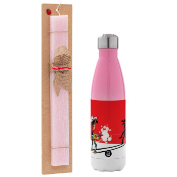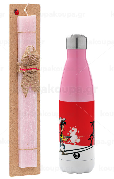 Λούκυ Λουκ σκιές, Πασχαλινή Λαμπάδα με Μεταλλικό παγούρι θερμός Ροζ/Λευκό (Stainless steel), διπλού τοιχώματος, 500ml & κερί αρωματικό πλακέ (30cm) (ΡΟΖ)