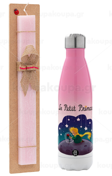 Ο μικρός πρίγκιπας, Πασχαλινή Λαμπάδα με Μεταλλικό παγούρι θερμός Ροζ/Λευκό (Stainless steel), διπλού τοιχώματος, 500ml & κερί αρωματικό πλακέ (30cm) (ΡΟΖ)