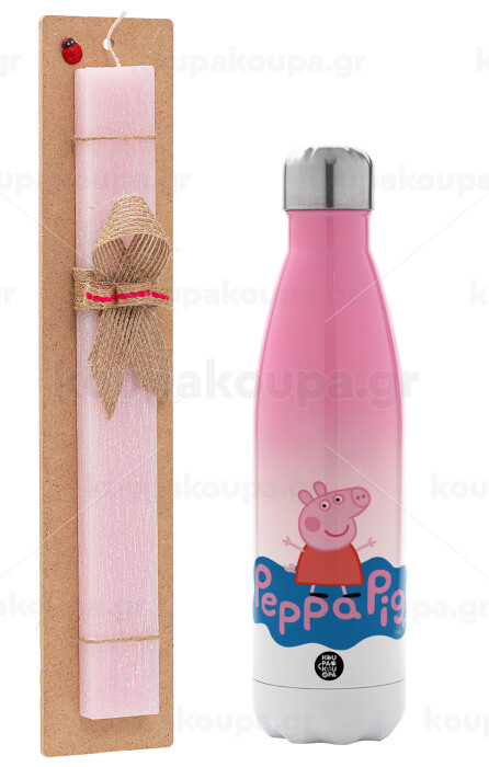 Πέππα το γουρουνάκι μπλε με όνομα, Πασχαλινή Λαμπάδα με Μεταλλικό παγούρι θερμός Ροζ/Λευκό (Stainless steel), διπλού τοιχώματος, 500ml & κερί αρωματικό πλακέ (30cm) (ΡΟΖ)
