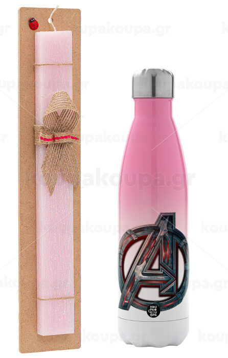 Avengers, Πασχαλινή Λαμπάδα με Μεταλλικό παγούρι θερμός Ροζ/Λευκό (Stainless steel), διπλού τοιχώματος, 500ml & κερί αρωματικό πλακέ (30cm) (ΡΟΖ)