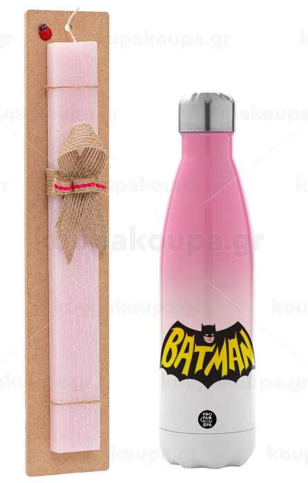 Batman classic logo, Πασχαλινή Λαμπάδα με Μεταλλικό παγούρι θερμός Ροζ/Λευκό (Stainless steel), διπλού τοιχώματος, 500ml & κερί αρωματικό πλακέ (30cm) (ΡΟΖ)