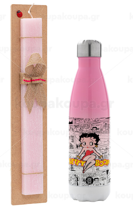 Betty Boop, Πασχαλινή Λαμπάδα με Μεταλλικό παγούρι θερμός Ροζ/Λευκό (Stainless steel), διπλού τοιχώματος, 500ml & κερί αρωματικό πλακέ (30cm) (ΡΟΖ)
