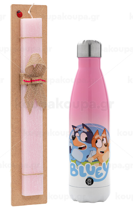 Μπλε, Πασχαλινή Λαμπάδα με Μεταλλικό παγούρι θερμός Ροζ/Λευκό (Stainless steel), διπλού τοιχώματος, 500ml & κερί αρωματικό πλακέ (30cm) (ΡΟΖ)