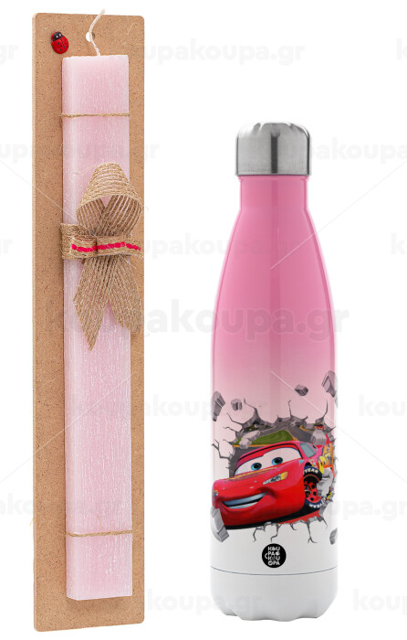 Brick McQueen, Πασχαλινή Λαμπάδα με Μεταλλικό παγούρι θερμός Ροζ/Λευκό (Stainless steel), διπλού τοιχώματος, 500ml & κερί αρωματικό πλακέ (30cm) (ΡΟΖ)