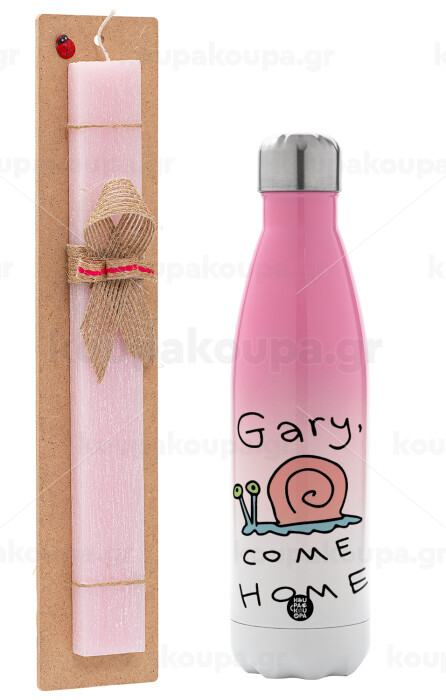 Gary come home, Πασχαλινή Λαμπάδα με Μεταλλικό παγούρι θερμός Ροζ/Λευκό (Stainless steel), διπλού τοιχώματος, 500ml & κερί αρωματικό πλακέ (30cm) (ΡΟΖ)