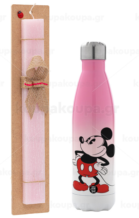 Mickey Classic, Πασχαλινή Λαμπάδα με Μεταλλικό παγούρι θερμός Ροζ/Λευκό (Stainless steel), διπλού τοιχώματος, 500ml & κερί αρωματικό πλακέ (30cm) (ΡΟΖ)
