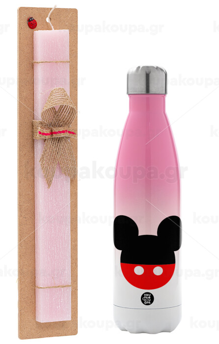 Mickey head, Πασχαλινή Λαμπάδα με Μεταλλικό παγούρι θερμός Ροζ/Λευκό (Stainless steel), διπλού τοιχώματος, 500ml & κερί αρωματικό πλακέ (30cm) (ΡΟΖ)