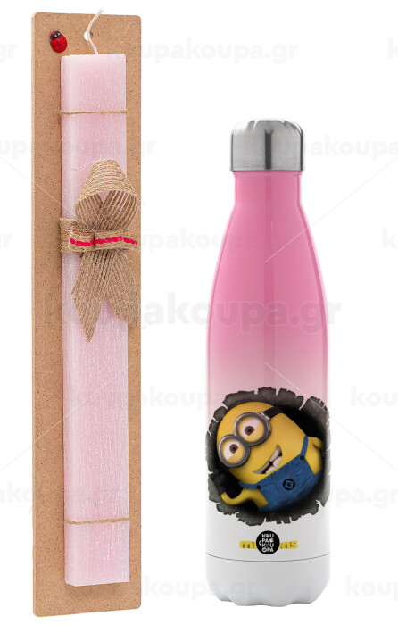 Minions hi, Πασχαλινή Λαμπάδα με Μεταλλικό παγούρι θερμός Ροζ/Λευκό (Stainless steel), διπλού τοιχώματος, 500ml & κερί αρωματικό πλακέ (30cm) (ΡΟΖ)