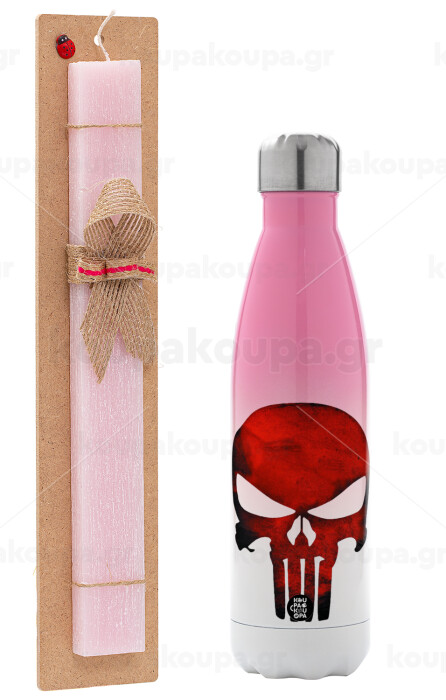 Red skull, Πασχαλινή Λαμπάδα με Μεταλλικό παγούρι θερμός Ροζ/Λευκό (Stainless steel), διπλού τοιχώματος, 500ml & κερί αρωματικό πλακέ (30cm) (ΡΟΖ)