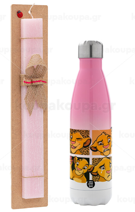 Simba, lion king, Πασχαλινή Λαμπάδα με Μεταλλικό παγούρι θερμός Ροζ/Λευκό (Stainless steel), διπλού τοιχώματος, 500ml & κερί αρωματικό πλακέ (30cm) (ΡΟΖ)
