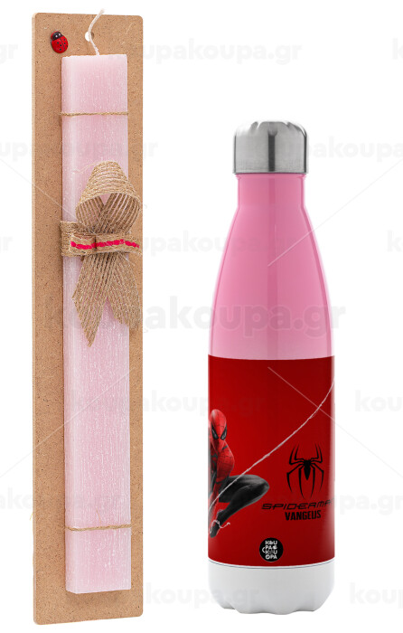 Spiderman, Πασχαλινή Λαμπάδα με Μεταλλικό παγούρι θερμός Ροζ/Λευκό (Stainless steel), διπλού τοιχώματος, 500ml & κερί αρωματικό πλακέ (30cm) (ΡΟΖ)