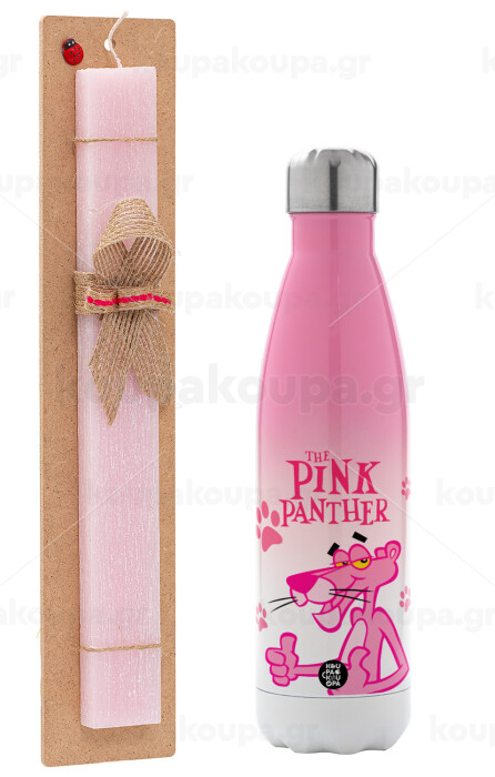 The pink panther, Πασχαλινή Λαμπάδα με Μεταλλικό παγούρι θερμός Ροζ/Λευκό (Stainless steel), διπλού τοιχώματος, 500ml & κερί αρωματικό πλακέ (30cm) (ΡΟΖ)