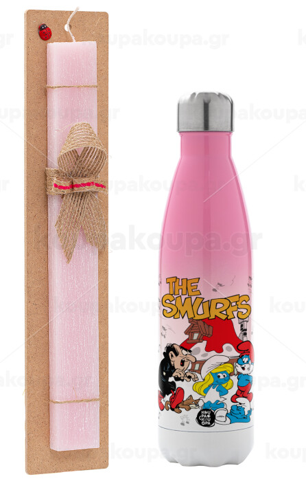 Τα στρουμφάκια, Πασχαλινή Λαμπάδα με Μεταλλικό παγούρι θερμός Ροζ/Λευκό (Stainless steel), διπλού τοιχώματος, 500ml & κερί αρωματικό πλακέ (30cm) (ΡΟΖ)