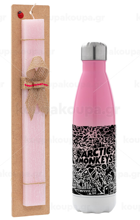 Arctic Monkeys, Πασχαλινή Λαμπάδα με Μεταλλικό παγούρι θερμός Ροζ/Λευκό (Stainless steel), διπλού τοιχώματος, 500ml & κερί αρωματικό πλακέ (30cm) (ΡΟΖ)