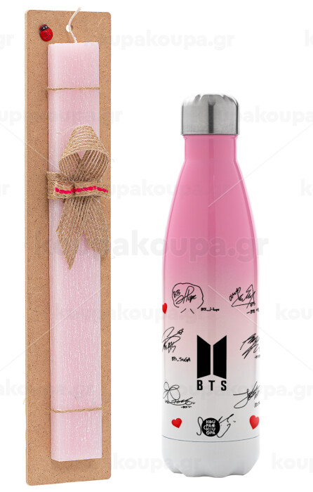 BTS signatures, Πασχαλινή Λαμπάδα με Μεταλλικό παγούρι θερμός Ροζ/Λευκό (Stainless steel), διπλού τοιχώματος, 500ml & κερί αρωματικό πλακέ (30cm) (ΡΟΖ)