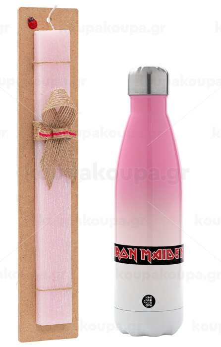 Iron maiden, Πασχαλινή Λαμπάδα με Μεταλλικό παγούρι θερμός Ροζ/Λευκό (Stainless steel), διπλού τοιχώματος, 500ml & κερί αρωματικό πλακέ (30cm) (ΡΟΖ)