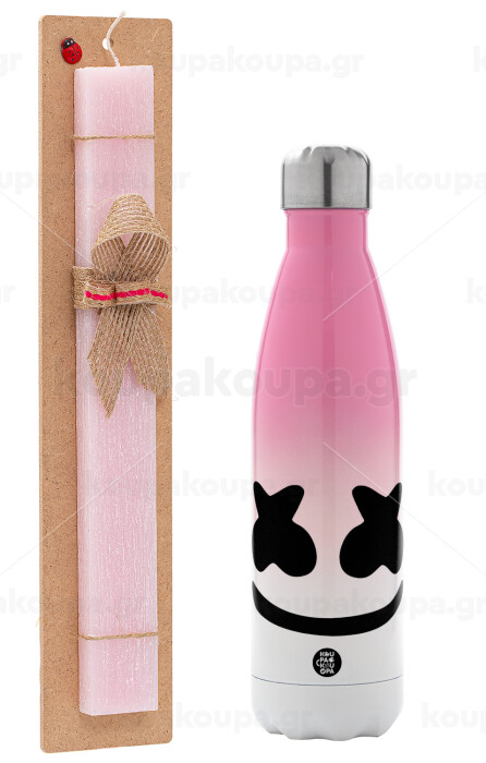 Marshmello, Πασχαλινή Λαμπάδα με Μεταλλικό παγούρι θερμός Ροζ/Λευκό (Stainless steel), διπλού τοιχώματος, 500ml & κερί αρωματικό πλακέ (30cm) (ΡΟΖ)