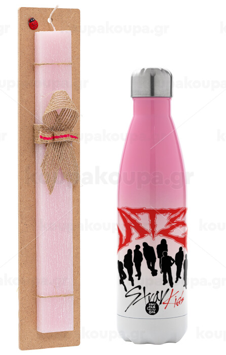Stray Kids Boy band, Πασχαλινή Λαμπάδα με Μεταλλικό παγούρι θερμός Ροζ/Λευκό (Stainless steel), διπλού τοιχώματος, 500ml & κερί αρωματικό πλακέ (30cm) (ΡΟΖ)