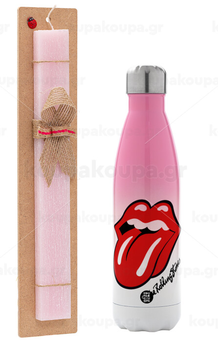 The rolling stones, Πασχαλινή Λαμπάδα με Μεταλλικό παγούρι θερμός Ροζ/Λευκό (Stainless steel), διπλού τοιχώματος, 500ml & κερί αρωματικό πλακέ (30cm) (ΡΟΖ)