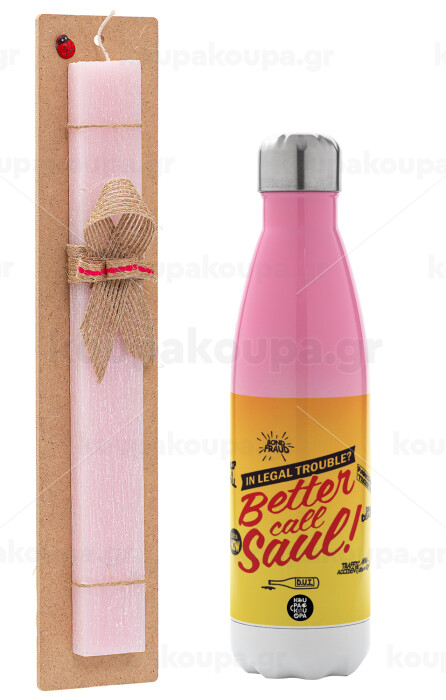 Better Call Saul, Πασχαλινή Λαμπάδα με Μεταλλικό παγούρι θερμός Ροζ/Λευκό (Stainless steel), διπλού τοιχώματος, 500ml & κερί αρωματικό πλακέ (30cm) (ΡΟΖ)