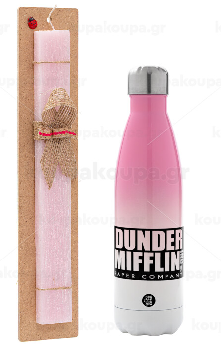 Dunder Mifflin, Inc Paper Company, Πασχαλινή Λαμπάδα με Μεταλλικό παγούρι θερμός Ροζ/Λευκό (Stainless steel), διπλού τοιχώματος, 500ml & κερί αρωματικό πλακέ (30cm) (ΡΟΖ)