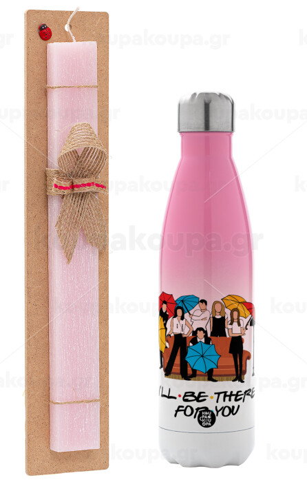Friends cover, Πασχαλινή Λαμπάδα με Μεταλλικό παγούρι θερμός Ροζ/Λευκό (Stainless steel), διπλού τοιχώματος, 500ml & κερί αρωματικό πλακέ (30cm) (ΡΟΖ)