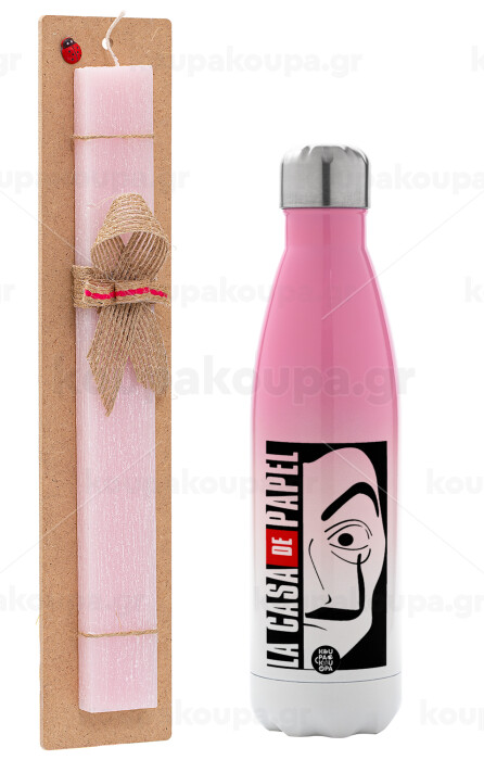 La casa de papel vertical, Πασχαλινή Λαμπάδα με Μεταλλικό παγούρι θερμός Ροζ/Λευκό (Stainless steel), διπλού τοιχώματος, 500ml & κερί αρωματικό πλακέ (30cm) (ΡΟΖ)