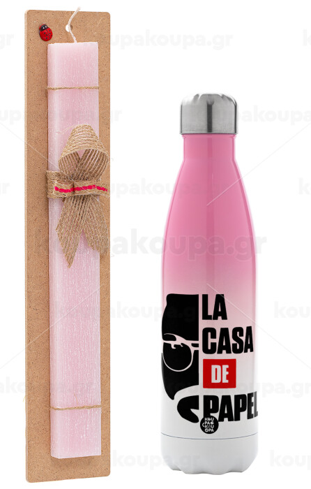 La casa de papel, Πασχαλινή Λαμπάδα με Μεταλλικό παγούρι θερμός Ροζ/Λευκό (Stainless steel), διπλού τοιχώματος, 500ml & κερί αρωματικό πλακέ (30cm) (ΡΟΖ)