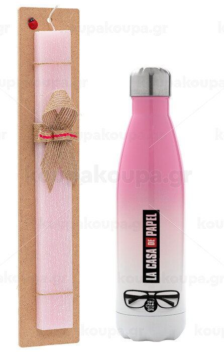 la professor, γυαλιά, Πασχαλινή Λαμπάδα με Μεταλλικό παγούρι θερμός Ροζ/Λευκό (Stainless steel), διπλού τοιχώματος, 500ml & κερί αρωματικό πλακέ (30cm) (ΡΟΖ)