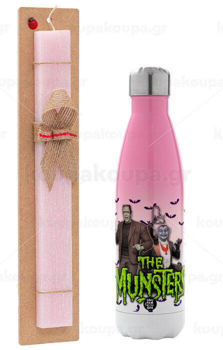 The munsters, Πασχαλινή Λαμπάδα με Μεταλλικό παγούρι θερμός Ροζ/Λευκό (Stainless steel), διπλού τοιχώματος, 500ml & κερί αρωματικό πλακέ (30cm) (ΡΟΖ)