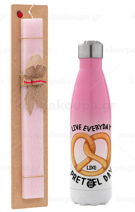 The office, Live every day like pretzel day, Πασχαλινή Λαμπάδα με Μεταλλικό παγούρι θερμός Ροζ/Λευκό (Stainless steel), διπλού τοιχώματος, 500ml & κερί αρωματικό πλακέ (30cm) (ΡΟΖ)