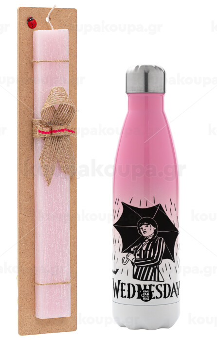 Wednesday Addams, Πασχαλινή Λαμπάδα με Μεταλλικό παγούρι θερμός Ροζ/Λευκό (Stainless steel), διπλού τοιχώματος, 500ml & κερί αρωματικό πλακέ (30cm) (ΡΟΖ)