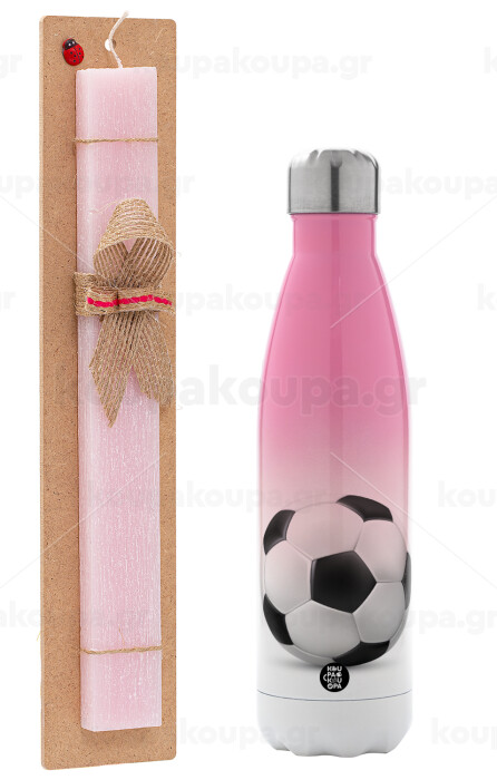 Μπάλα ποδοσφαίρου, Πασχαλινή Λαμπάδα με Μεταλλικό παγούρι θερμός Ροζ/Λευκό (Stainless steel), διπλού τοιχώματος, 500ml & κερί αρωματικό πλακέ (30cm) (ΡΟΖ)