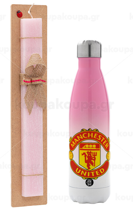 Manchester United F.C., Πασχαλινή Λαμπάδα με Μεταλλικό παγούρι θερμός Ροζ/Λευκό (Stainless steel), διπλού τοιχώματος, 500ml & κερί αρωματικό πλακέ (30cm) (ΡΟΖ)
