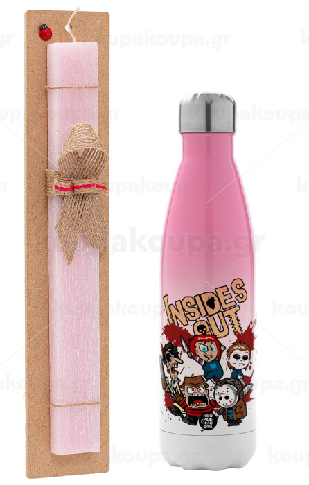Halloween Inside out, Πασχαλινή Λαμπάδα με Μεταλλικό παγούρι θερμός Ροζ/Λευκό (Stainless steel), διπλού τοιχώματος, 500ml & κερί αρωματικό πλακέ (30cm) (ΡΟΖ)
