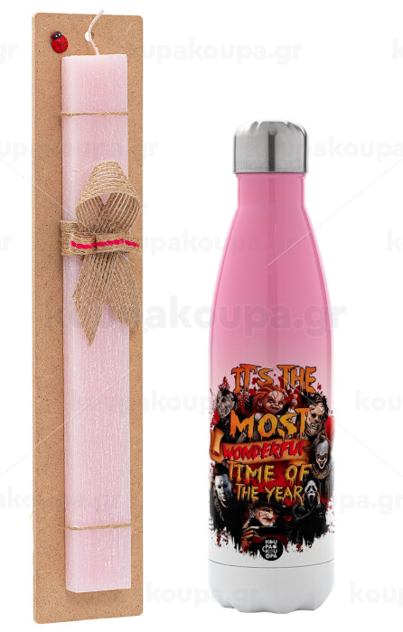 Halloween it's most wonderful time of the year, Πασχαλινή Λαμπάδα με Μεταλλικό παγούρι θερμός Ροζ/Λευκό (Stainless steel), διπλού τοιχώματος, 500ml & κερί αρωματικό πλακέ (30cm) (ΡΟΖ)
