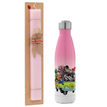 Stitch Halloween scooby car, Πασχαλινή Λαμπάδα με Μεταλλικό παγούρι θερμός Ροζ/Λευκό (Stainless steel), διπλού τοιχώματος, 500ml & κερί αρωματικό πλακέ (30cm) (ΡΟΖ)