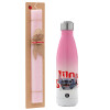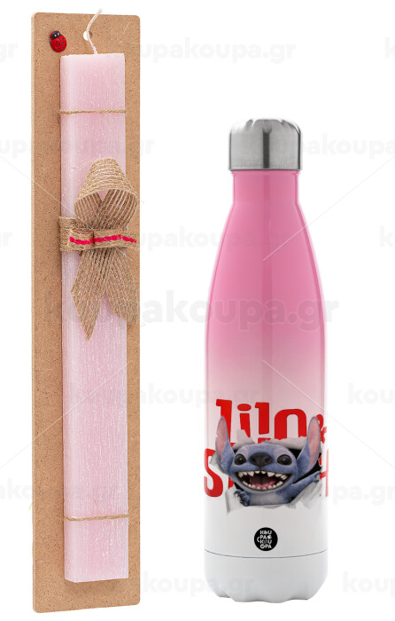 Stitch movie, Πασχαλινή Λαμπάδα με Μεταλλικό παγούρι θερμός Ροζ/Λευκό (Stainless steel), διπλού τοιχώματος, 500ml & κερί αρωματικό πλακέ (30cm) (ΡΟΖ)