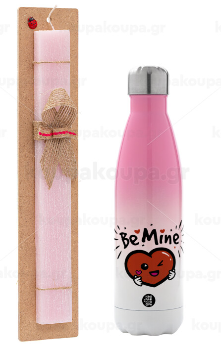 Be mine!, Πασχαλινή Λαμπάδα με Μεταλλικό παγούρι θερμός Ροζ/Λευκό (Stainless steel), διπλού τοιχώματος, 500ml & κερί αρωματικό πλακέ (30cm) (ΡΟΖ)