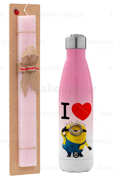 I love by minion, Πασχαλινή Λαμπάδα με Μεταλλικό παγούρι θερμός Ροζ/Λευκό (Stainless steel), διπλού τοιχώματος, 500ml & κερί αρωματικό πλακέ (30cm) (ΡΟΖ)