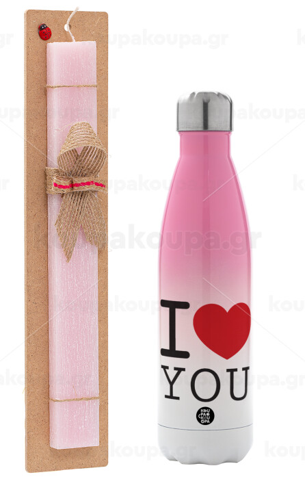 I Love you classic, Πασχαλινή Λαμπάδα με Μεταλλικό παγούρι θερμός Ροζ/Λευκό (Stainless steel), διπλού τοιχώματος, 500ml & κερί αρωματικό πλακέ (30cm) (ΡΟΖ)