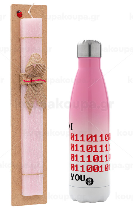 I .... YOU, binary secret MSG, Πασχαλινή Λαμπάδα με Μεταλλικό παγούρι θερμός Ροζ/Λευκό (Stainless steel), διπλού τοιχώματος, 500ml & κερί αρωματικό πλακέ (30cm) (ΡΟΖ)