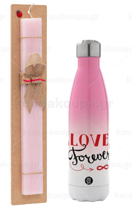 Love forever ∞, Πασχαλινή Λαμπάδα με Μεταλλικό παγούρι θερμός Ροζ/Λευκό (Stainless steel), διπλού τοιχώματος, 500ml & κερί αρωματικό πλακέ (30cm) (ΡΟΖ)